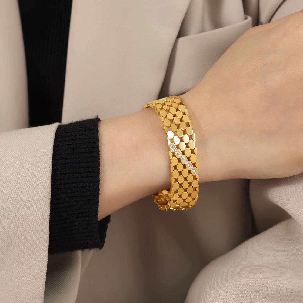 • الإكسسوارات: بعض الأساور مزينة بأحجار زركون براقة أو ألماس صناعي لإضافة لمسة فاخرة.