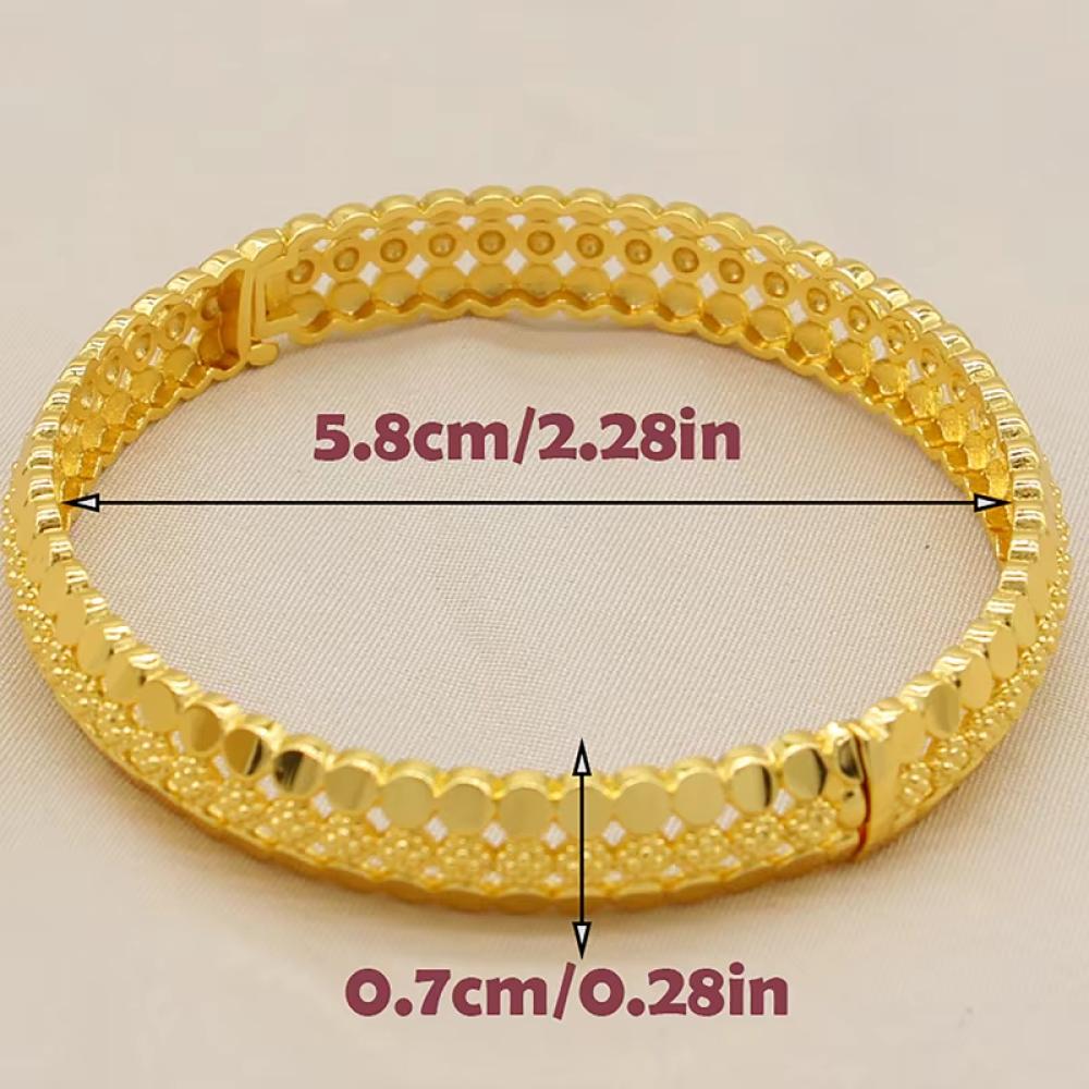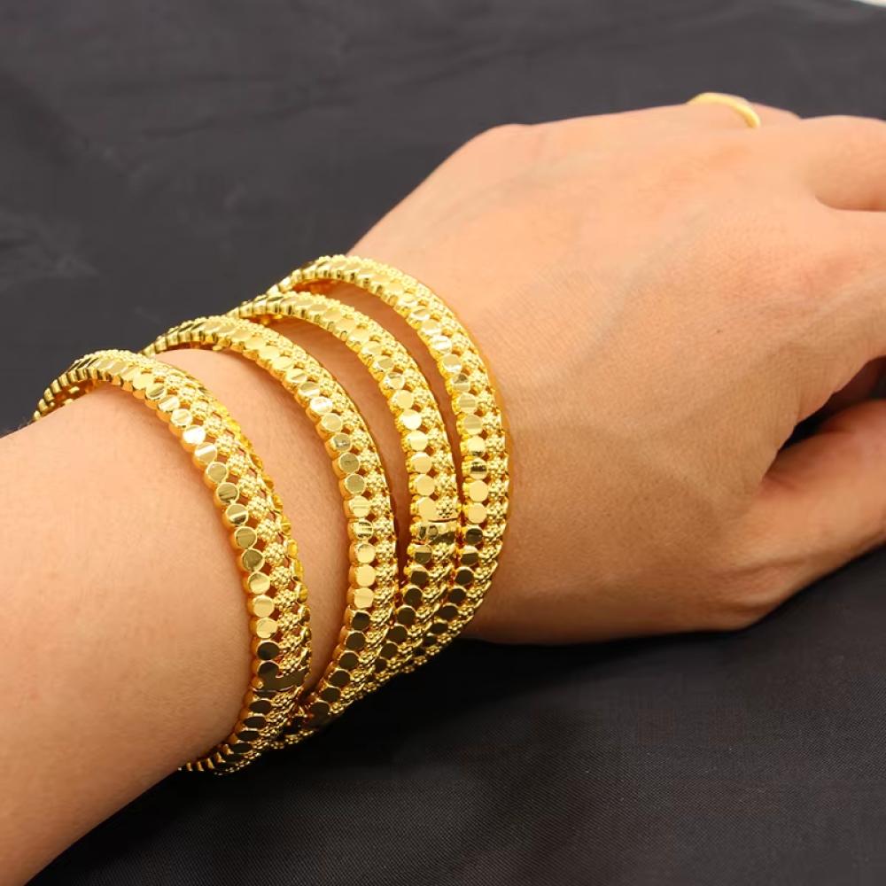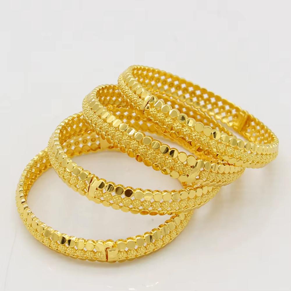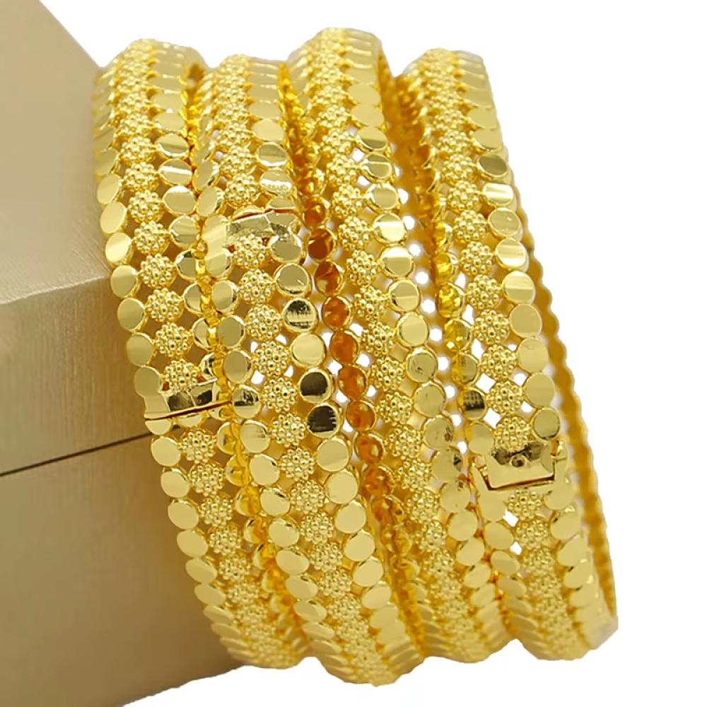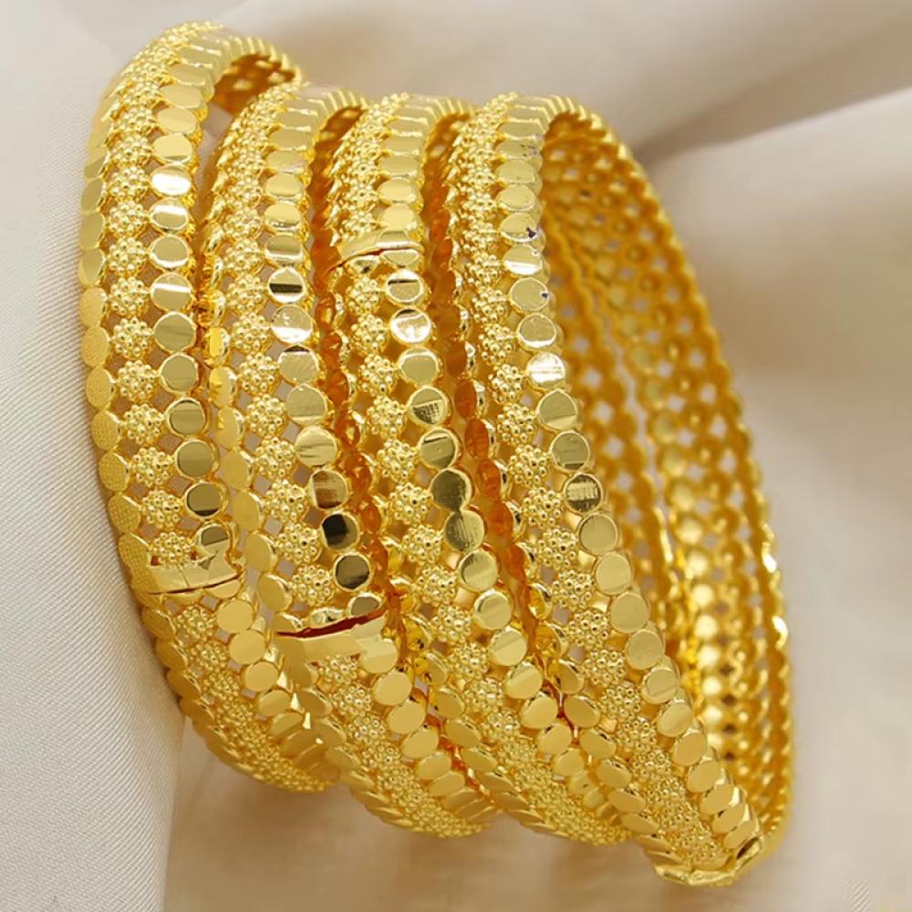 اساور هندية تمنحك إطلالة فاخرة وأنيقة مع تصميم تقليدي مستوحى من الطراز الهندي، مطلية بالذهب لتضفي لمعانًا رائعًا ولمسة فخمة على معصمك في المناسبات والأفراح. هذه الأساور تجمع بين الحرفية الدقيقة والزخارف الرائعة لتكمل أي إطلالة مميزة.